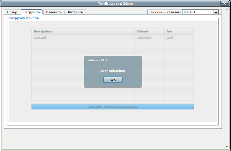 xshader 0 Опубликовано 10 декабря, 2010 Жалоба Share Опубликовано 10 декабря, 2010 Возникла проблема загрузки файлов более 1Мб через TinyBrowser в php.ini 2Мб в .htaccess php_value upload_max_filesize 20M php_value post_max_size 20M php_value max_execution_time 200 php_value max_input_time 200 до 1Мб все отлично, но больше никак. Вроде загружает, но в конце пишет Status: 413 Error uploading скриншот ошибки прилагается. Может кто сталкивался с такой проблемой. в /admin/includes/javascript/tiny_mce/plugins/tinybrowser/config_tinybrowser.php // File upload size limit (0 is unlimited) $tinybrowser['maxsize']['image'] = 0; // Image file maximum size $tinybrowser['maxsize']['media'] = 0; // Media file maximum size $tinybrowser['maxsize']['file'] = 0; // Other file maximum size Ссылка на сообщение Поделиться на другие сайты