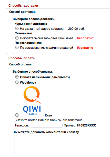 Moralex 0 Опубликовано 5 октября, 2011 Жалоба Share Опубликовано 5 октября, 2011 Решение нашлось очень простое: В модуле оплаты Наличными самовывоз /lang/russian/modules/payment/cash.php убираем слово "(самовывоз)" и все становится понятно и просто, так как именно слово "(самовывоз)" сбивает с толку при быстром заказе. Ссылка на сообщение Поделиться на другие сайты